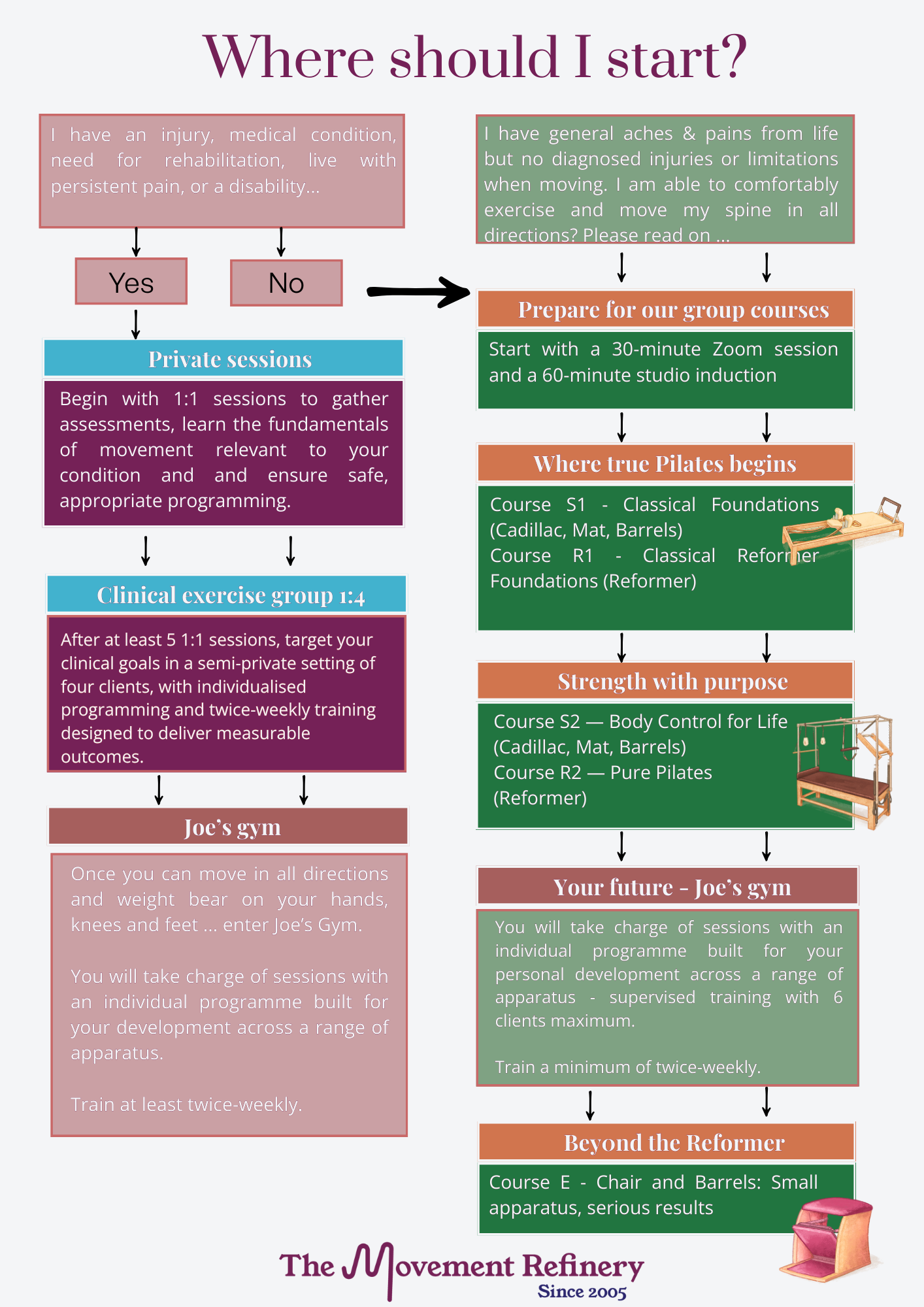 We are thrilled to welcome any new client who would like to understand their body and how to live comfortably in their skin. We offer traditional Pilates in a variety formats and have purpose built sessions for all bodies and experience as well as those with clinical requirements.